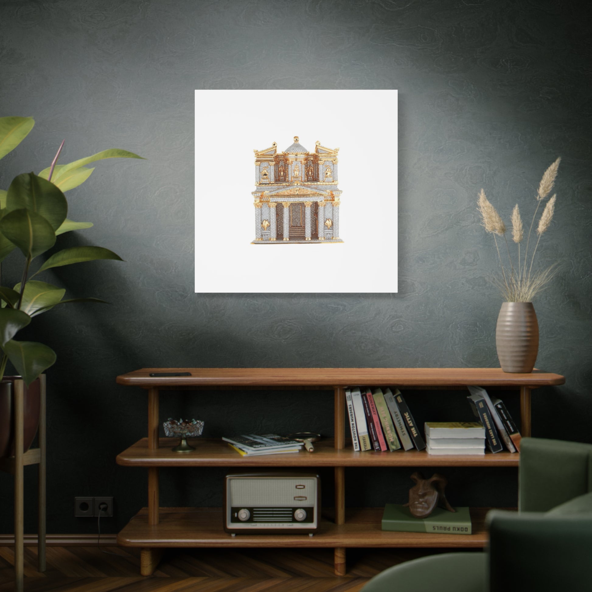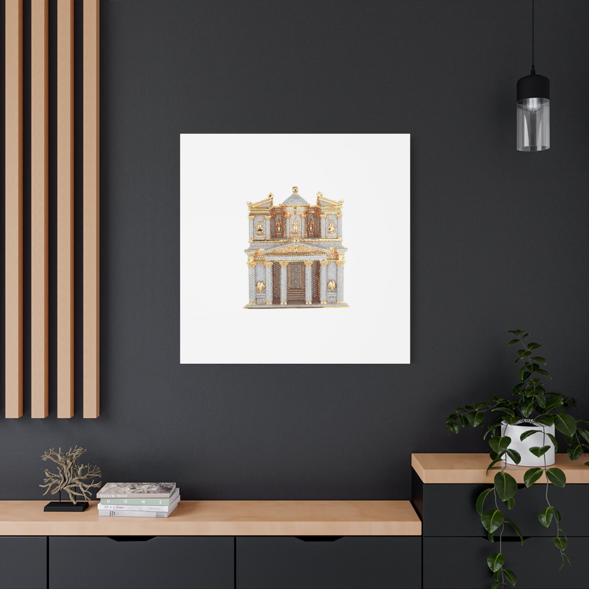 This stretched matte canvas brings quiet grandeur to small spaces. A delicate architectural motif — rendered in soft grays and warm gold accents — sits centered on a clean white field, letting the fine details breathe. The subtle texture of the cotton-poly canvas and the low-reflective matte finish give the piece an understated, museum-like presence. Lightweight yet sturdy on its 1.25" pine profile, it hangs flush and steady thanks to the included back-hanging hardware and soft rubber dots that protect surfaces. It feels like a found treasure you can place above a bedside table, tuck into a gallery wall, or set on a narrow ledge to add old-world character without overwhelming the room.